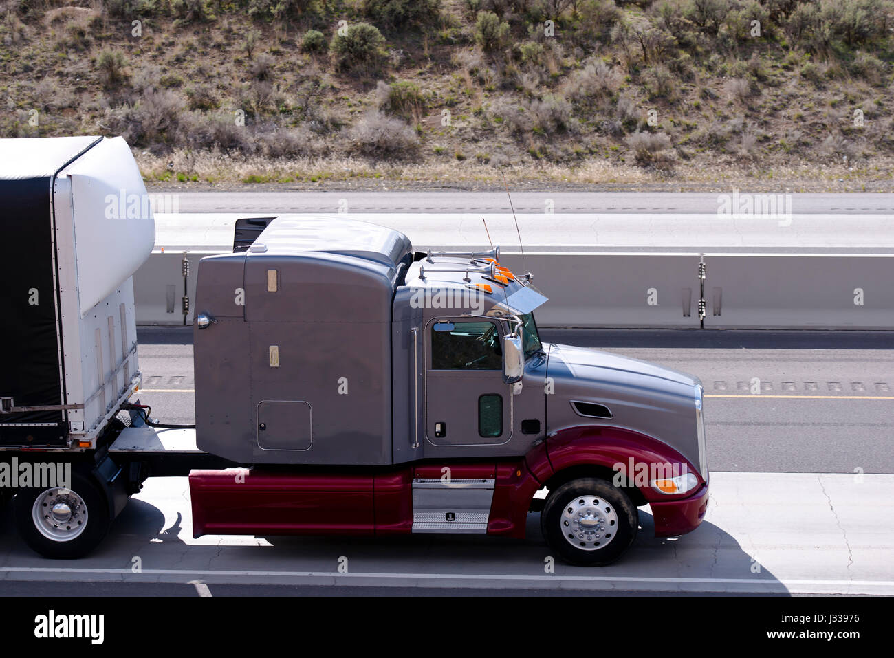Two Colors Classic Modern Semi Truck And Trailer On The Road With Grass On Background Stock Photo Alamy